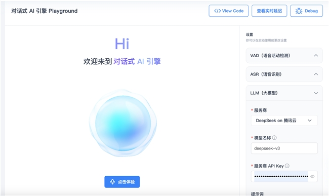 在 DeepSeek-V3-0324 上线当日,声网对话式 AI 引擎就已同步支持。开发者可以根据需要在 Playground 中调用,仅需2行代码,15分钟即可部署基于DeepSeek的对话式AI Agent。