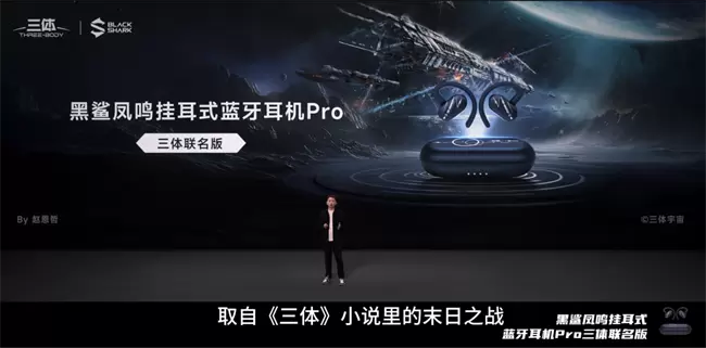 同时也推出了一款联名挂耳式蓝牙耳机——黑鲨凤鸣挂耳式蓝牙耳机Pro 三体联名版,以《三体》中“末日之战”为灵感,深邃机身嵌入闪光云母粒子,模拟宇宙繁星与“水滴”的压迫感,呼应科幻叙事的同时强化收藏属性。