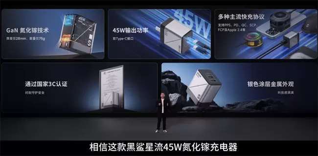 “好马配好鞍”,随着黑鲨制冷背夹功率升级至35W,为解决玩家对高兼容性充电设备的需求,黑鲨推出电源领域新品——黑鲨星流45W氮化镓充电器。此前推出的黑鲨星流67W氮化镓充电器以2C1A三接口、大功率快充及折叠设计,成为多设备用户的“全能助手”。而这次带来的新品45W氮化镓充电器采用双C口设计与可折叠插脚,体积较传统充电器更小;搭载智能功率分配技术,可同时为手机与高功率散热器供电,兼容PPS、PD、QC、SCP、FCP及Apple 2.4等多种主流快充协议,并通过国家3C安全认证,兼顾高效输出与用电安全,旨成为玩家应对多设备充电场景的“隐形助手”。