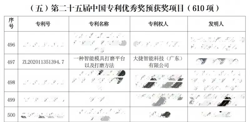 大捷智能科技(广东)有限公司(下文简称“大捷智能”)科技创新团队联合季华实验室历经数年潜心研发,创造性地提出了一种集成了高精度传感器、智能算法控制、自动化执行机构于一体的智能模具打磨平台技术,彻底颠覆传统模具打磨依赖人工经验、效率低下、精度难以保证的痛点。该技术大捷智能已申请发明专利《一种智能模具打磨平台及其方法》,并获得国家知识产权局授权。刚刚过去的第二十五届中国专利奖,大捷智能凭此发明专利斩获“中国专利优秀奖”。