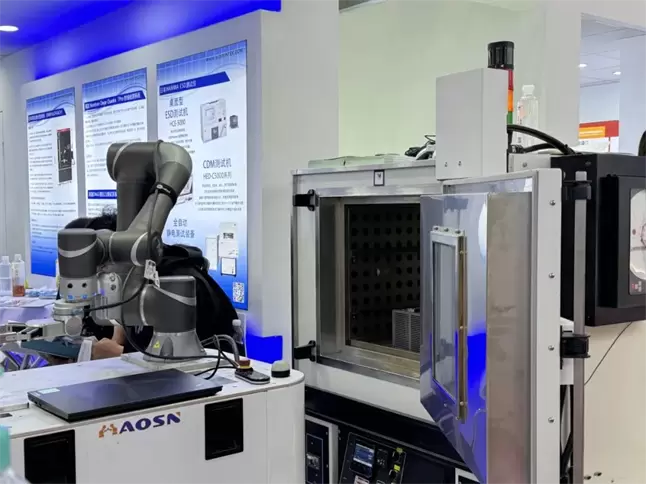 达明机器人通过自研专利TM Landmark动态视觉补偿技术,突破了半导体行业的精度瓶颈。在上海半导体展(SEMICON China) 展会现场,达明机器人与合作伙伴展示了,整合 AGV/AMR与TM Landmark技术进行晶圆盒抓取搬运与半导体高温固化炉上下料的解决方案。