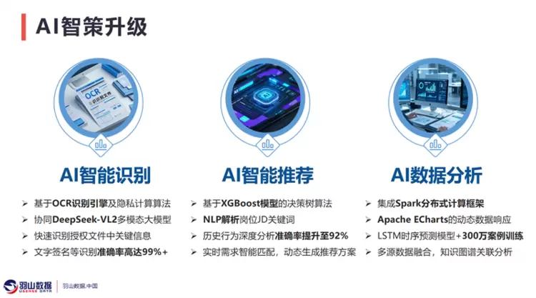 羽山数智背调方案实现了AI智策的全面升级。采用AI智能识别技术,基于 OCR 识别引擎、隐私计算算法和 DeepSeek - VL2 多态大模型,快速精准识别授权文件(如:PDF,JPEG,PNG)。识别准确率高达99%,精准识别文字及签名等各类信息。