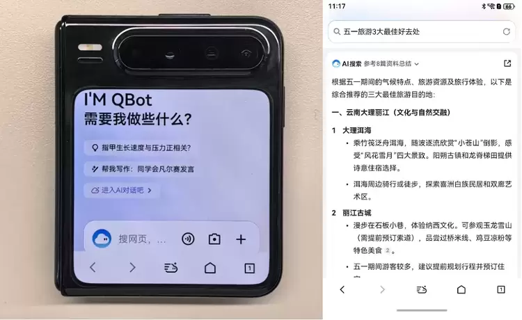 针对华为Pura X阔折叠屏特性,QQ浏览器实现内外屏智能切换:外屏单手操作快速调用AI搜索、进入QBot对话等,便于快速获取信息;展开1610超阔屏后自动切换多窗口视图,网页、文档、笔记并行处理效率倍增。配合鸿蒙5的跨端协同能力,用户还可实现手机、平板的搜索记录与文件无缝流转,以及跨设备复制粘贴等创新功能。