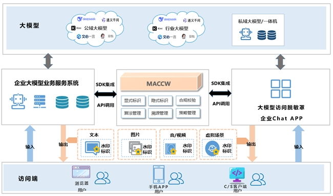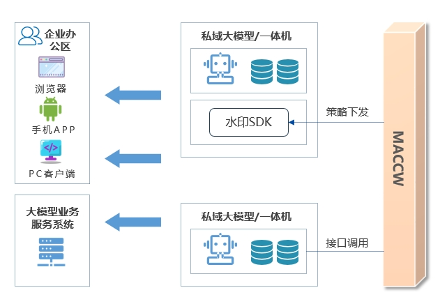 大模型业务服务系统部署安装MACCW的水印SDK或调用MACCW的API接口,当业务系统从公域大模型、私域大模型/一体机获取生成合成内容后,通过MACCW生成内容进行自动标识。
