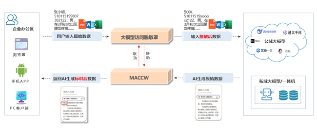 MACCW采用旁路方式接入用户网络,通过与大模型访问脱敏罩结合,实现用户与大模型之间数据上传、数据生成、数据防护的全方位安全保障,如下图所示: