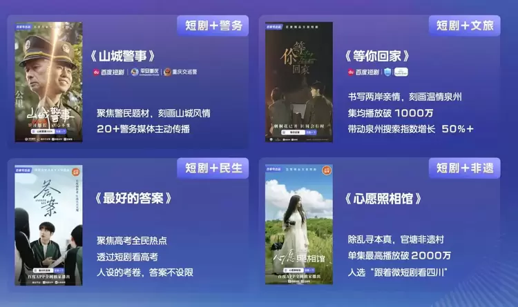 在市场需求的强力驱动下,微短剧逐渐从“流量优先”转向“内容为王”的精品化发展阶段。想要在如今的环境下脱颖而出,更要聚焦内容的立意和创新。过去一年,百度短剧一直坚持在新题材上不断进行探索创新,比如在短剧+警务上,联合平安重庆、重庆交巡警共创了微短剧《山城警事》,聚焦警民题材,刻画山城风情。短剧+文旅方向联合泉州文旅,从两岸亲情的角度出发,共创了微短剧《等你回家》,集均播放量破1000万,带动泉州当地在百度上的搜索指数增长50%。在短剧+非遗方向,创作的《心愿照相馆》展现了四川本地官塘非遗村的文化风情,单集最高播放破2000万,入选了“跟着微短剧看四川”的推荐项目。