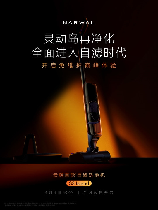 3月31日消息,今日云鲸智能官方在社交平台宣布将于4月1日发布首款自滤洗地机S3 Island,并于当天上午10:00开启全网预售。据了解,云鲸于去年9月推出科学旗舰系列S2 Island,该产品首次搭载多功能集成基站——自清洁灵动岛,集成了基站毛发切割、高温热水洗、高温静音熨干等多项功能,而此次云鲸即将发布的新品S3 Island为该系列迭代产品。