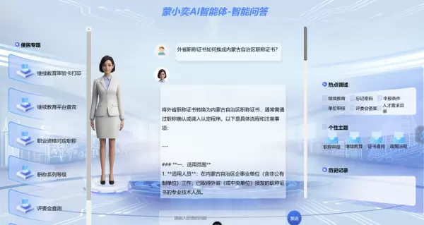 通过“通用大模型+垂直知识库”的双引擎架构,蒙小奕既能理解“请帮我分析中级工程师评审条件”这类泛化需求,也能精准解答“2024年内蒙古自治区电子信息类工程师继续教育学时要求”等细分问题,真正实现“问得深、答得准”。