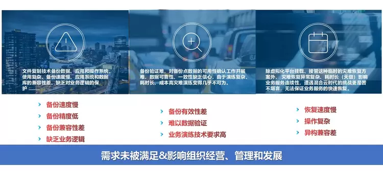 面对数字化转型进程持续深化带来的新需求,传统灾备技术体系正面临多维挑战:在数据备份环节存在效率低下、精度不足等技术瓶颈,主流备份方案对新型应用系统及数据库等因业务需求新上的产品兼容覆盖率严重不足,且普遍缺乏对核心业务逻辑的完整性保障;灾备验证过程需耗费大量人力搭建仿真环境,操作复杂度与专业门槛居高不下;应急恢复场景中,传统方案平均耗时长达数小时,异构系统适配能力薄弱,严重影响业务连续性。