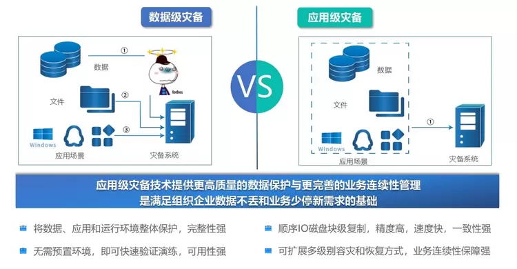 应用级灾备可提供更高质量的数据保护,不仅保护数据,还保护运行环境和业务逻辑,备份精度高、速度快、资源占用低,是数据复制首选技术;