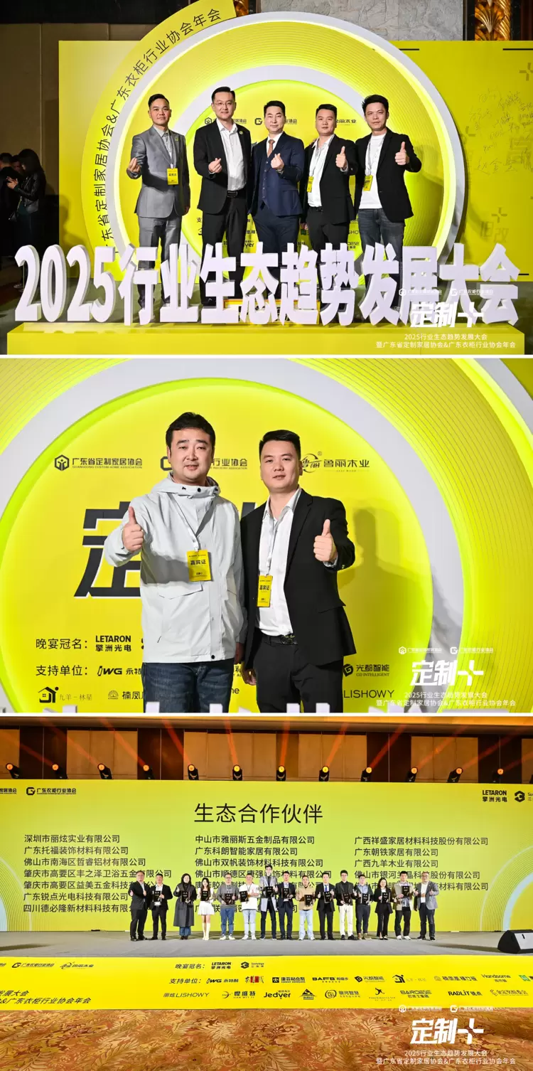 3月30日,“定制+—2025行业生态趋势发展大会暨广东省定制家居协会、广东衣柜行业协会年会”在广州香格里拉酒店盛大举办,丽炫照明受邀出席本次大会,并荣获“生态合作伙伴”奖项。这一荣誉不仅是对丽炫照明在定制家居照明领域的高度认可,更是其在行业生态合作中积极作为的有力见证。