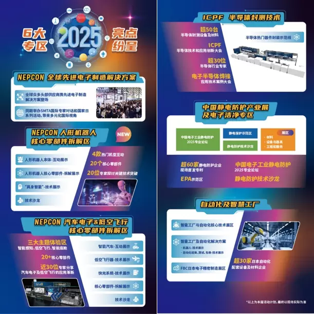 本届展会创新打造六大特色细分专区,NEPCON全球先进电子制造解决方案、NEPCON人形机器人核心零部件拆解区、NEPCON汽车电子&低空飞行核心零部件拆解区、ICPF半导体封测技术、中国静电防护产业展及电子洁净专区、自动化及智慧工厂,满足不同行业观众的寻新品、探趋势、拓人脉的商务需求,打造一场精彩绝伦的电子制造科技盛会。