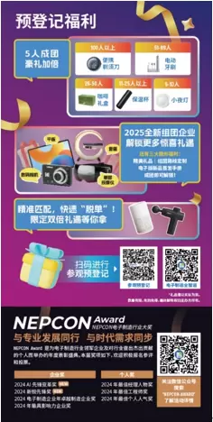 立即行动!电子人提前预登记组团,即可现场领取多重豪礼。还有NEPCON TAP买家专属定制服务+礼遇,立即扫码预登记,开启你的价值礼遇之旅,我们现场见!