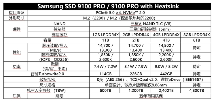 三星9100 PRO PCIe 5.0 NVMe M.2 固态硬盘,规格