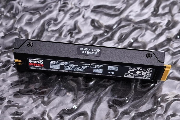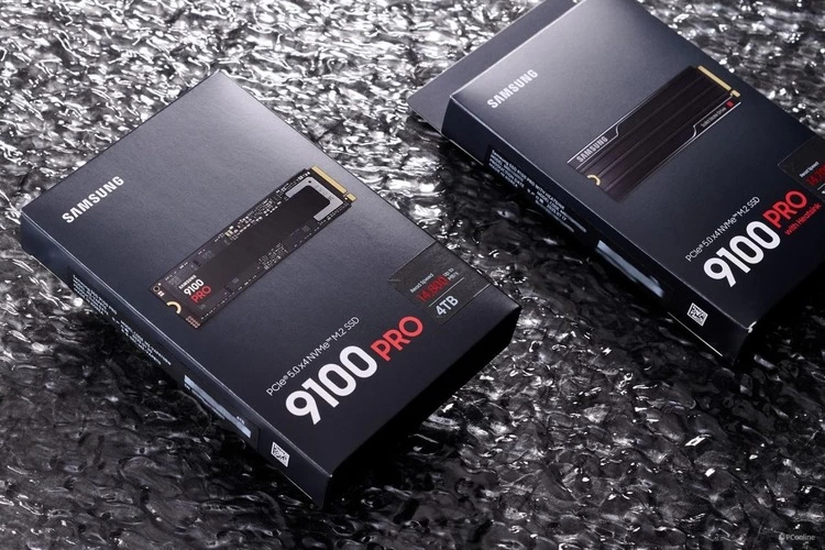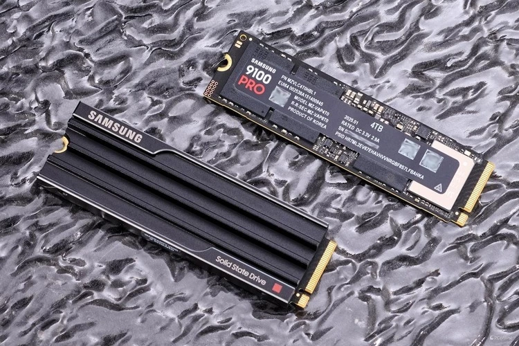 三星9100 PRO PCIe 5.0固态硬盘标准版与三星9100 PRO PCIe 5.0固态硬盘散热马甲版放一起一同展示。