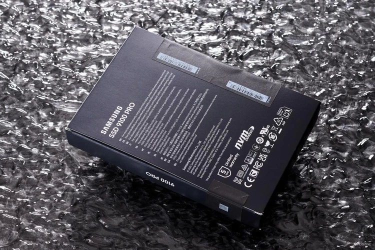 首先,从外观设计上来看,三星9100 PRO PCIe 5.0固态硬盘的包装延续了三星品牌最新的设计风格,由蓝色转变为更具“专业感”的黑色系设计。包装正面不仅印有完整的固态硬盘产品的彩色示意图,还突出了“9100 PRO”“PCIe 5.0 x4”“14800 MB/s”以及“4TB”存储容量等关键规格。
