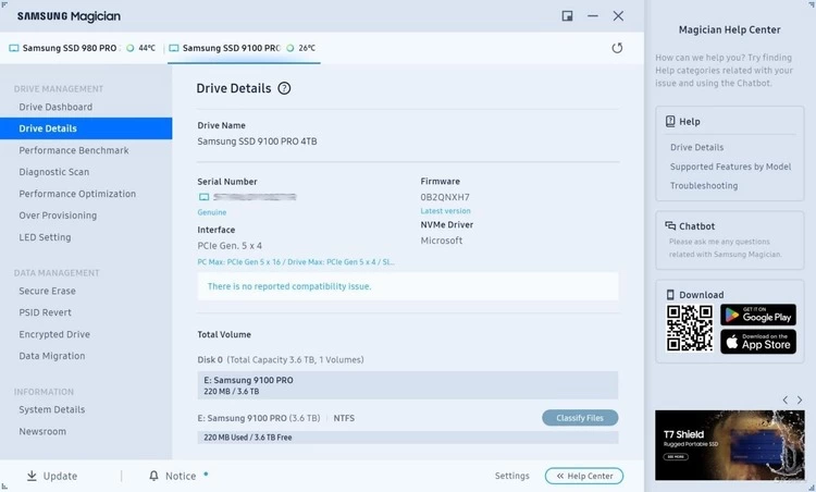 最新版本的三星Magician控制软件已经能完全识别出三星9100 PRO PCIe 5.0 固态硬盘。在软件里面不仅能监控到存储设备的运行状况还能进行诸如优化性能,保护有价值的数据,固件更新等系列操作及应用。