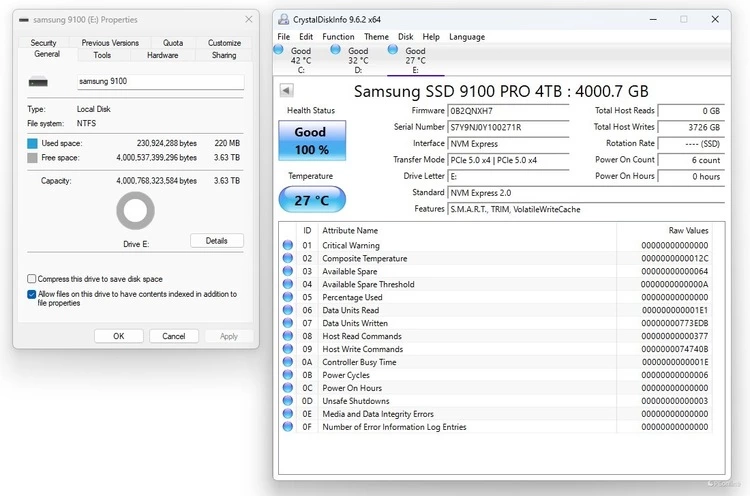 采用硬盘健康状况检测工具CrystalDiskInfo查看硬盘信息,我们看到三星9100 PRO PCIe 5.0 固态硬盘的固件版本位0B2QNXH7,传输模式为PCIe 5.0 x4,支持NVMe 2.0标准,支持S.M.A.R.T、TRIM以及VolatileWriteCache功能,待机温度为27度,其待机温度表现比同级产品有一定的优势。