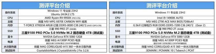 测试平台此次采用了两款,一个是AMD锐龙9 9950X处理器+微星MPG X870E CARBON Wi-Fi 暗黑主板,另外一套平台为INTELi9-14900K处理器+微星MEG Z790 ACE MAX战神主板,分别对三星9100 PRO PCIe 5.0 固态硬盘进行测试。
