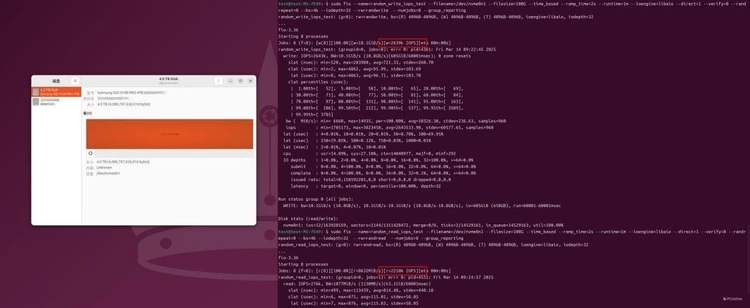 为了进一步验证性能,我们在相同的测试平台上切换至Ubuntu 24.04.2 LTS操作系统,并使用FIO软件对三星9100 PRO PCIe 5.0固态硬盘进行了峰值IOPS测试。通过点击上图放大,您可以查看详细的命名行与设计参数。在QD256线程32的测试条件下,三星9100 PRO PCIe 5.0固态硬盘的4K随机读写峰值性能分别表现为:读取2210K IOPS和写入2639K IOPS。测试结果表明,该硬盘在Ubuntu系统下的性能不仅优于之前的Windows系统测试,而且超出了三星官方公布的标称值。