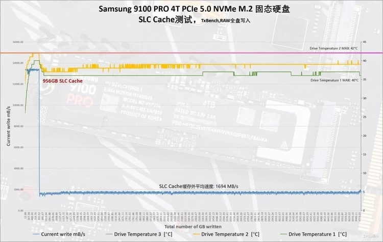 接下来,我们将对三星9100 PRO PCIe 5.0固态硬盘的SLC缓存容量进行测试。通过在RAW状态下使用TxBench进行全盘写入测试,并借助HWINFO64软件监控温度,我们发现其SLC缓存容量高达956 GB。