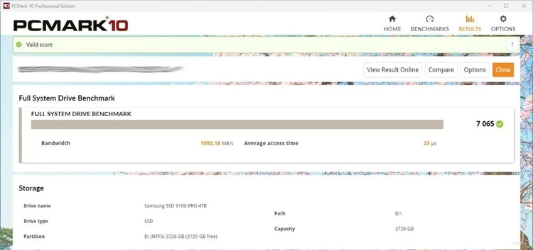 在PCMark 10的存储基准测试中,三星9100 PRO PCIe 5.0固态硬盘在完整数据盘测试中获得了7065分,带宽高达1092.18 MB/s,平均访问时间仅为23微秒。这一成绩在同价位固态硬盘中处于顶尖(T0)水平。