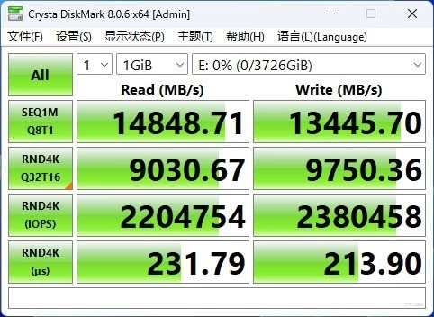 在性能测试环节,我们首先执行了CrystalDiskMark的空盘测试。结果显示,在1GiB的SeqQ8T1读写测试中,读取速度达到了14848.71MB/s,而写入速度则为13445.70MB/s,这两项指标均超过了三星官方公布的标称值。在4K随机读写性能方面,通过Windows平台上的CrystalDiskMark软件测试,我们得到了读取2204K IOPS和写入2380K IOPS的结果。整体性能十分出色。