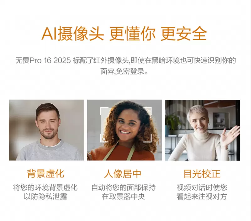 除此之外,无畏Pro16 锐龙版 2025的周边配置也同样给力。高清AI摄像头可依托处理器NPU提供的AI算力,实现多种微软工作室人像效果,背景虚化、目光校正等可谓是视频会议必备神器,同时支持红外人脸识别,解锁登录一步到位。另外在机身轻约1.79kg,薄至1.59cm的前提下,提供双全功能USB-C+双USB-A+HDMI 2.1等接口,满足多种设备外接需求。还有ErgoSense长键程背光键盘,搭配大尺寸顺滑触控板,满足日常各类办公场景下使用需求。