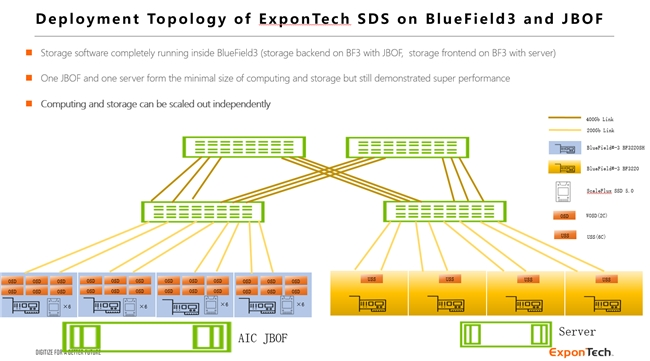 1台2U AIC JBOF作为存储服务器, 配备4块NVIDIA BlueField3 DPU, 提供1600Gbps网络带宽,24块ScaleFlux CSD5000 NVMe SSD,ExponTech WADP存储软件的后端运行于BlueField3 DPU内;