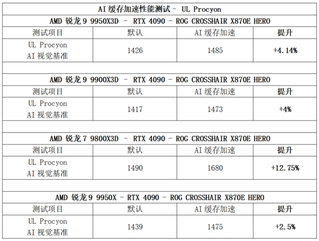 鉴于NVIDIA 50系显卡普及率还不高,我们又换用RTX 4090显卡进行跨代验证。测试结果表明,在锐龙7 9800X3D平台上,AI缓存加速引擎仍可带来最高7.57%的性能增幅。