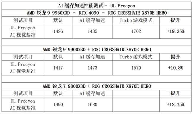 结合AMD锐龙7 9800X3D在Geekbench AI与UL Procyon基准测试中的出色表现不难看出:相较于锐龙9 9950X3D/9900X3D的核心数量优势,3D V-Cache技术发挥着更关键的作用。为进一步验证这一点,我们在启用AI缓存加速引擎的基础上,进一步激活了Turbo游戏模式进行交叉验证。