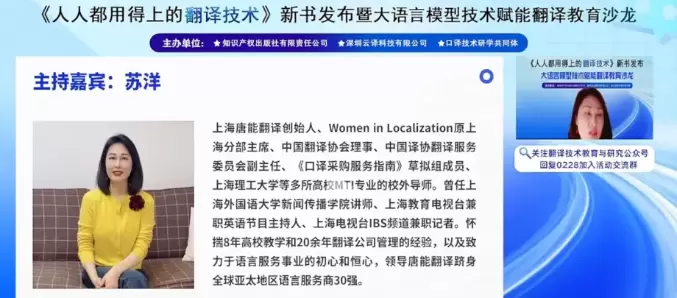2025年2月28日晚,《人人都用得上的翻译技术》新书发布会暨大语言模型赋能翻译教育沙龙活动成功举办。唐能翻译公司总经理苏洋女士受邀担任活动主持人,为这场行业盛会拉开帷幕。