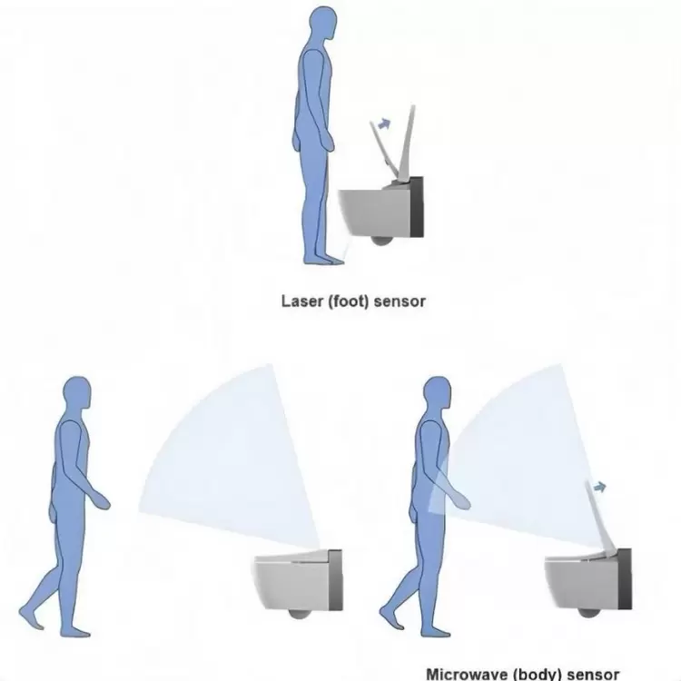 在关盖关圈状态下,微波传感到人从远处径向走入1m范围内,上盖才会打开,如果是开盖状态,将脚置于脚感范围内,激光感应功能会使坐圈自动打开,但日常不会频繁进行感应,只有高度大于0.6m时才会触发开盖功能,并且感应距离可调节,便于调整至最适合自己的模式,规避宠物或扫地机器人误触。