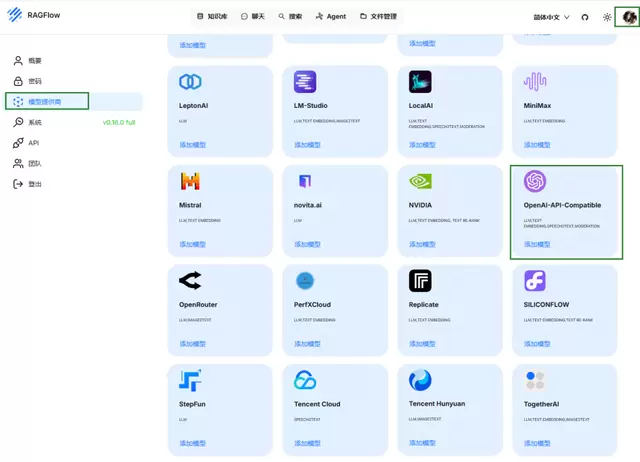 2.点击右上角用户头像,在左侧导航栏选择模型供应商,并点击OpenAI-API-Compatible。