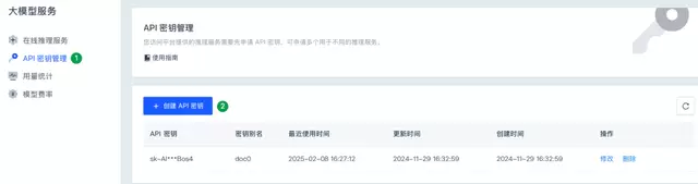 3.进入大模型服务管理页面,在左侧导航栏中选择 API 密钥管理,创建并获取 API 密钥。