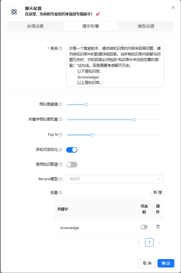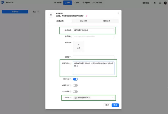 2.在聊天配置页签中,完成助理设置各项参数的配置,点击确定。