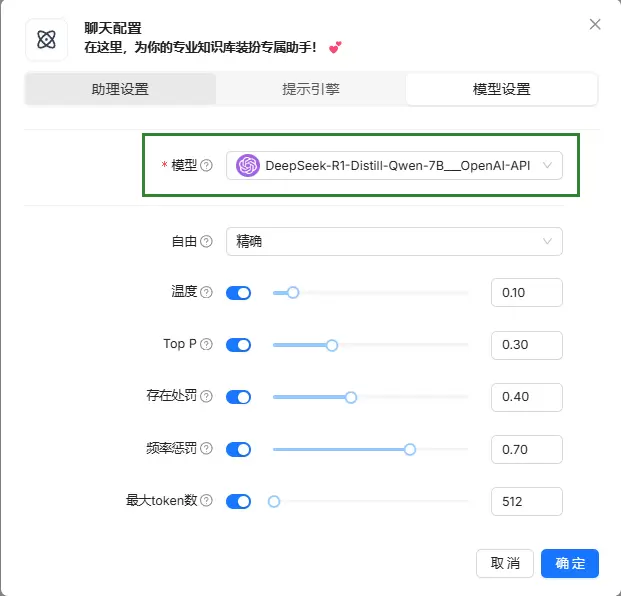 4.进入模型设置页签,模型参数选择前文中添加的大语言模型,其他参数根据实际情况修改或保持默认,点击确定。