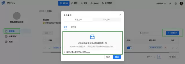 3.在新建的知识库页面,点击左侧导航栏中的数据集,点击右侧新增文件,在弹出的上传文件窗口中,选择本地文件,点击确定。
