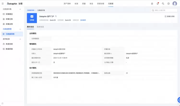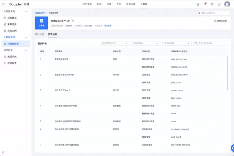 1.报表元数据自动采集:支持采集指定 Quick BI工作空间下的报表元数据,不仅包括报表名称、描述、公开状态等基本信息,也包括包含的所有图表信息:如图表类型(柱状图、折线图等)、每个图表的维度、度量信息,构建“报表-图表-数据元素”的层级关联图谱。