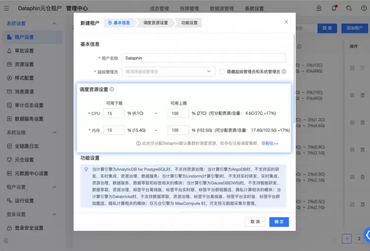 -可用下限:当资源紧张时(所有租户都需要超过下限额度的资源来运行任务),所有租户优先获得所设置的下限额度;
