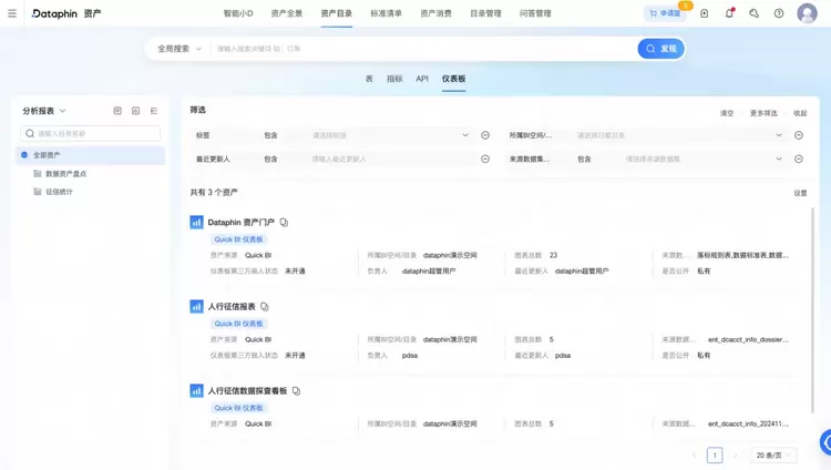 3.资产上架,统一管理:采集到的报表会作为一种资产类型整合到 Dataphin 的资产运营目录,与数据表、指标、API等资产进行统一管理。您可以在目录管理后台为每个报表配置归属目录、自定义标签、图表展示名等信息,并控制在资产前台的查看权限,进而实现报表资产的精细化运营。