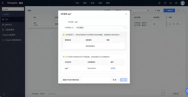API详情页和版本比对功能支持展示接口的调用模式,同时在接口发布时,系统会对调用模式的变更进行校验。