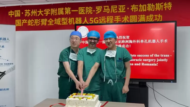 中国北京时间2025年4月2日凌晨、罗马尼亚布加勒斯特时间4月1日傍晚,一场跨越8000公里的中欧远程手术引发全球医疗界震动——国际胸外科权威专家 Diego González Rivas教授团队与苏州大学附属第一医院(以下简称“苏附一”)赵军教授团队携手合作为欧洲的一位患者成功实施肺癌右肺上叶肿瘤根治切除术,这不仅仅是中国原创的手术机器人—术锐®蛇形臂单孔机器人在欧洲临床的首秀,还是全球范围内首次由单孔手术机器人完成的胸外科远程手术,更开启了中国原创的蛇形臂手术机器人技术全球输出的新纪元。本次手术的主刀医生团队位于中国苏州,患者身处罗马尼亚布加勒斯特,罗马尼亚胸外科专家Dr. Mugurel Bosinceanu现场配合。这场手术所彰显的里程碑意义,不仅仅标志着外科微创技术的又一次突破,更标志着中国原创的高端医疗装备开始获得欧洲权威认可,开启“中国智造”向全球顶尖发达市场输出的历史性新进程。