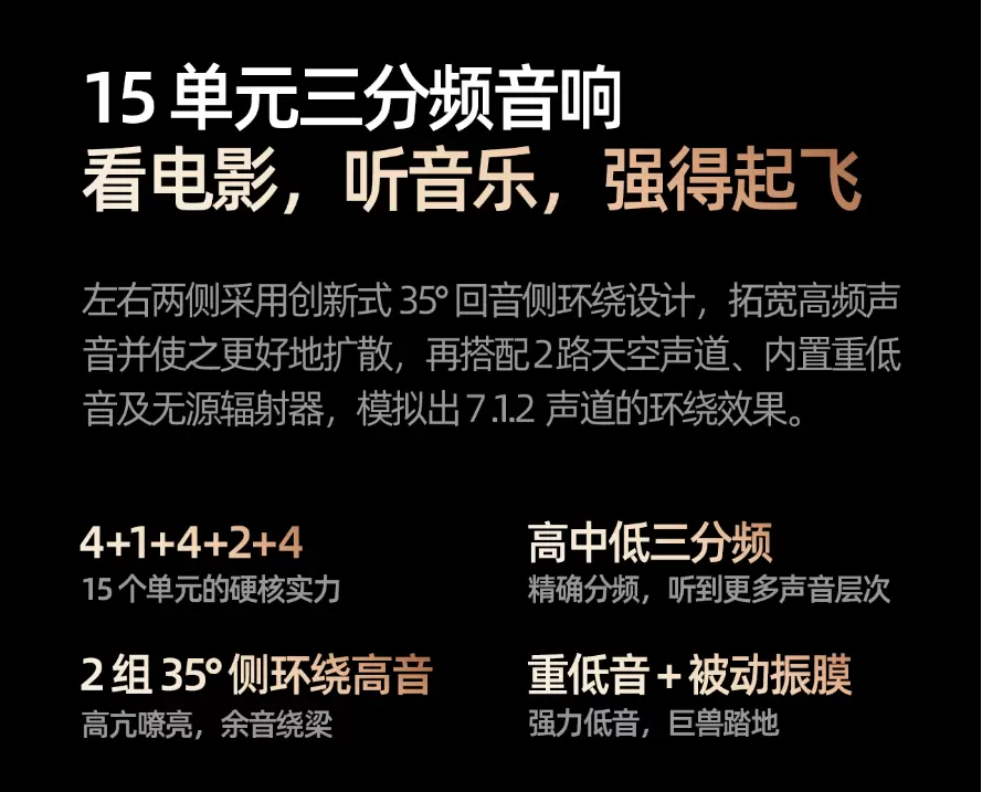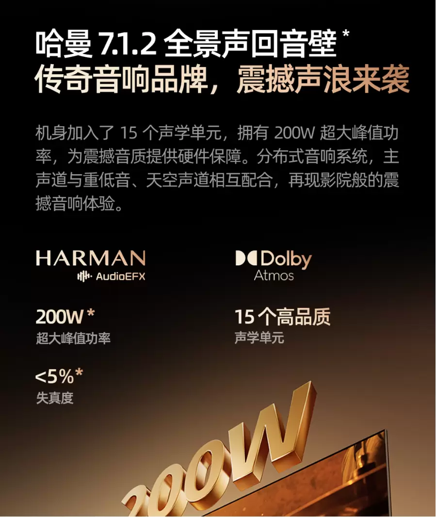 创维A6F Pro内置哈曼调校回音壁,额定功率70W ,峰值功率高达200W。回音壁不仅拥有两侧独立环绕高音,还搭载了低音炮和天空声场,并特别打造了有15颗高品质声学单元的三分频音响系统,最终实现7.1.2 杜比全景声环绕声效。其构建的旗舰级声学架构,让整体音效可实现高、中、低频层次分明,观影时人声清晰,背景音细节尽显,营造出更真实的立体声场。