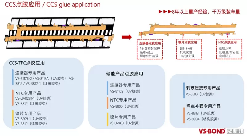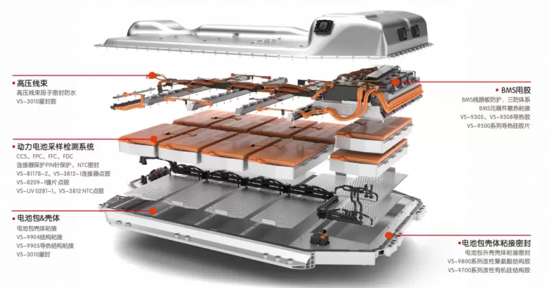 此外,博翔电子材料研发推出NTC热敏电阻密封防护。在NTC密封防护方面,公司以梯度固化丙烯酸聚氨酯体系为核心,实现技术突围。表层采用丙烯酸聚氨酯融合树脂快速固化(5min@80℃),形成致密疏水层,吸水率<1.2%。使得产品点胶后满足新能源汽车动力电池带电浸水500h的测试要求,可完全防止水汽对NTC的侵蚀,避免新能源汽车电池包的温度监控因水汽侵入失效,电池包温度采集异常而导致热失控发生起火。同时内层通过聚氨酯柔性交联网络使胶层热膨胀系数(CTE)与PIN针壳体塑胶材料匹配度达95%,-40℃~125℃冷热冲击1000次无开裂。该技术打破美国陶氏的氟硅树脂密封胶长期市场垄断,并且实现技术指标全面领先。