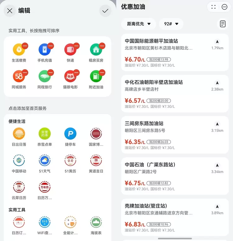 快捷工具之下便是负一屏的八宫格服务区。用户可以在这里点击所需的元服务或应用获取日常高频服务,无论是生活缴费、手机充值、汽车加油,还是快递查询、买电影票、机酒预定,你添加的元服务或应用都能快速跳转,无需下载节省内存,实用又方便。同时,新版本负一屏服务支持用户在长按后进入“编辑”模式,可拖拽自由排序或灵活替换常用元服务或应用,操作自由度更高,布局个性化十足。清明期间自驾踏青,就可以用负一屏【附近加油】查看周边的加油站及相关加油优惠,非常省心。