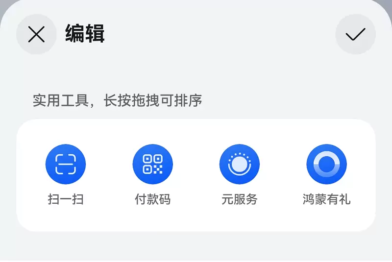 超市排队结账时,付款码半天找不到?在HarmonyOS 5最新版的负一屏内,支持四大快捷工具“扫一扫”、“付款码”、“元服务”、“鸿蒙有礼”的自由排序。用户只需长按工具图标,进入“编辑”模式后通过拖拽调整顺序,让工具贴合自己的个人喜好与操作习惯。例如:将“扫一扫”拖至最右侧,单手扫码更舒适,“付款码”置于首位,结账时秒开不耽误。至此,负一屏上的快捷工具可以灵活适配使用场景,你的负一屏由你做主。