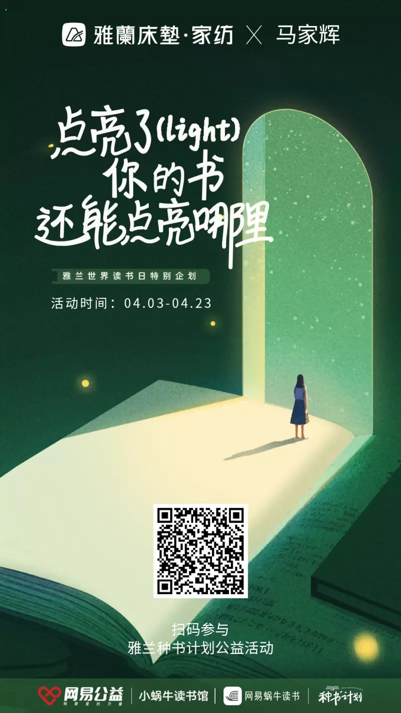 在第30个世界读书日到来之际,雅兰携手网易蜗牛读书APP、网易公益|小蜗牛读书馆,共同发起以“睡前读好书,自然有好梦”为主题的“世界读书日特别企划”。活动倡导“阅读与睡眠”的健康生活方式,号召公众以阅读滋养精神、以好眠焕活身心。同时,活动还联动线上线下开展捐书活动,旨在传递知识和公益的力量。知名作家、文化学者马家辉受邀担任活动领读人及“种书计划”公益伙伴,以其深厚的文化底蕴和独特的智性视角,为活动注入深度与温度。