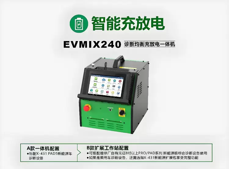 EVMIX240 以用户需求为核心,打造差异化配置方案。A 款一体机标配 X-431 PAD5 新能源汽车诊断设备,集诊断与充放电功能于一身,即装即用,为中小维修场景提供高性价比选择;B 款扩展工作站则聚焦专业维修厂,可无缝衔接元征 8 吋以上 PRO/PAD 系列新能源版综合诊断设备,搭配 X-431 新能源扩展包,更能激活乘用车诊断设备完整功能,无论作业规模大小,皆能高效适配,让维护工作更从容。