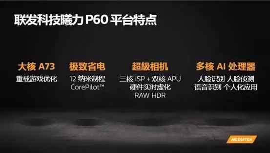 Helio P60是联发科在MWC 2018才正式发布的主流处理器,具有四个核心的功能卖点,包括A73大核、极致省电、超级相机以及多核AI处理器,可以说不仅是性能方面,Helio P60在游戏,拍照以及AI方面都有很大的优化,在同级的产品中具有很出色的竞争力。